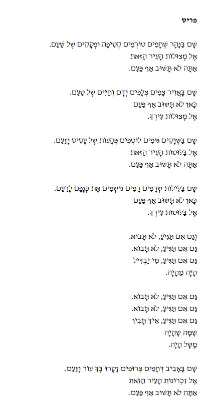 מן הבָּאר הפלגנו אל הנהר. חצינו גשרים ודקלמנו שירה: בודליר, אפולינר, מלארמה, רביקוביץ', וולך. חצינו גשר ואת זה שאחריו. עוד גשר וגם את זה שבא. דורי ודורית מזגזגים ביעף מ'פּון סן-לואי' ל'פון נוטר-דם', מ'פון דו פאלֶא' ל'פֹון נֶף', מ'פון דז אר' ל'פון דו קרוסל', עד שנגמרה העיר.