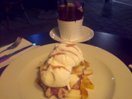 – "פעמיים סיידר חם עם יין", הוא מזמין, "וגם וופל בלגי, אבל שיהיה עם קצפת, עם סירופ, עם גלידה, ושיהיה חם".